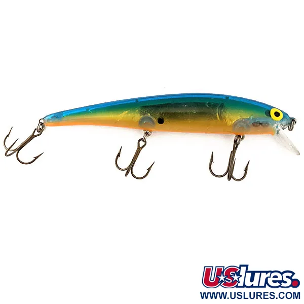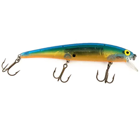 Guld- och orangefärgade sidor som övergår i en mörkblå rygg definierar det klassiska XBBO-färgmönstret på denna amerikansktillverkade minnow. Med en längd på 12 cm (4 3/4") och en vikt på 12 g (2/5 oz) uppvisar detta Bomber Long A-exemplar den slanka profil som blivit en stapelvara för gös- och gäddfiskare. Just denna 11375-modell är en suspender, konstruerad för att sväva i vattenpelaren vid kastdjup på 0,6 - 0,9 m (2-3 ft) eller trolldjup mellan 1,2 - 2,4 m (4-8 ft). Inuti den genomskinliga kroppen syns de interna rasselkamrarna, vilka ger en specifik akustisk profil under hemtagning. Tre vassa trekrokar är monterade via robusta fjäderringar, vilket speglar den hållbarhet som var typisk för Bombers USA-tillverkade era. De gula ögonen med stora svarta pupiller ger en högkontrastpunkt mot de glimrande guldsidorna. Detta exemplar är i 5/5 skick och har kvar sin ursprungliga fabriksfinish och klara plastdetaljer.