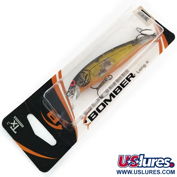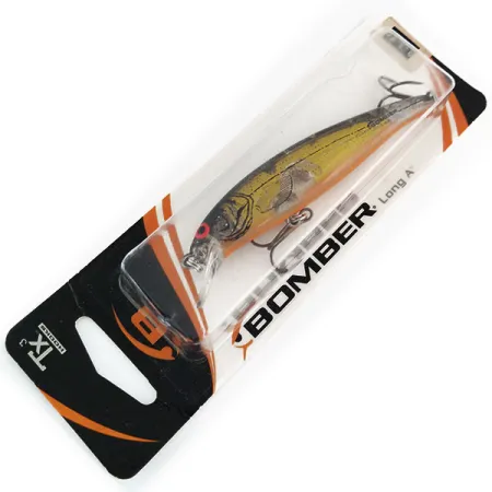 Med en längd på exakt 9 cm (3 1/2") förblir den slanka profilen hos denna klassiska jerkbait en stapelvara för sportfiskare som jagar allt från gös till abborre. Just denna modell, produktkod 9809, har färgschemat XCHO – en gulguldfärgad kropp med mörka vertikala ränder och ett högvisst rött öga. Med en vikt på 9,5 g (1/3 oz) är betet designat för mångsidighet i olika vattenlager; det når djup på 0,6–0,9 m vid spinnfiske, eller djupare zoner på 1,2–2,4 m vid trolling. Vintageförpackningen indikerar att denna enhet monterades i Mexiko och levereras utrustad med Tx3-krokar. Detta exemplar är oanvänt och ligger kvar i sin originalförpackning, vilket bevarar Bomber Lures-logotypen från 2004-eran och den klara, fyrkantiga skeden. Det är ett välskött exempel ur B14A-serien, lämpligt för fiske efter både svartabborre, småmunnad gälabborre och strimmig bas.