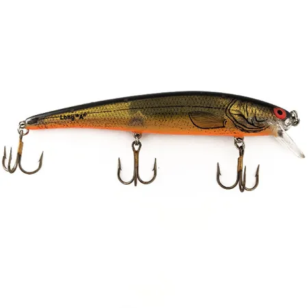 Med en längd på 12 cm (4 3/4") har den slanka profilen på detta jerkbait ett klassiskt guld- och svart fiskfjällsmönster som kontrasteras av en levande orange buk. Tre skarpa trekrokar är säkert fästa på undersidan, en standardkonfiguration för ett bete av denna längd. På sidan nära stjärten är "Long 'A'"-stämpeln tydligt synlig, vilket markerar det som en del av Bombers USA-tillverkade historia. Just detta exemplar, produktkod 11840, är ett rullande svävande (suspending) bete med rasselkammare, byggt för att hålla sin position i vattenpelaren på djup mellan 1,2–1,8 m (4–6 fot). Betet väger 14 g (1/2 oz) och är balanserat för både spinnfiske och trolling. Röda ögon och mörka gällappsdetaljer ger en slående fokuspunkt mot den metalliska guldfinishen. Vid granskning av utsidan är skicket en ren 5/5. Den klara plastskeden är stadigt integrerad i nosen och ger det nödvändiga motståndet för dess avsedda djupintervall.