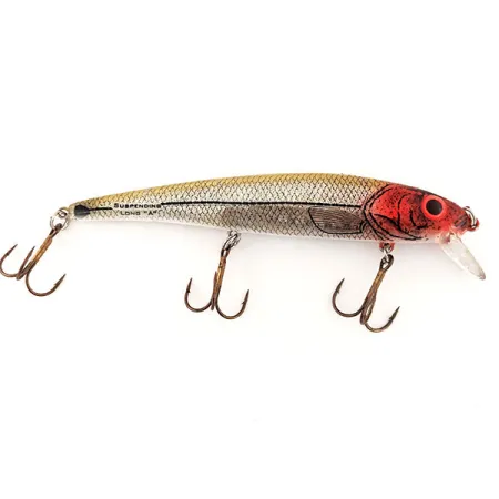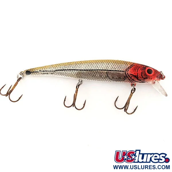 Ett slående rött huvud kontrasterar skarpt mot den silverfjälliga kroppen på detta klassiska USA-tillverkade exemplar. Med en vikt på 14 g (1/2 oz) och en längd på 12 cm (4 3/4"), bär denna Bomber Long A15A produktkoden 12865 och har den igenkännbara stämpeln "SUSPENDING LONG 'A'" tydligt tryckt på sidan. Denna rasslande suspender är designad för både spinnfiske och trolling och når djup mellan 1,2–1,8 m (4–6 fot). Det silverfärgade nätfjällmönstret kompletteras av en tydlig mörk sidolinje och ett rödmarkerat öga. Alla tre original-trekrokar sitter säkert monterade, vilket återspeglar dess välbevarade skick på 5/5. Den klara, rundade skeden är ren och intakt, fast monterad i betets nos.