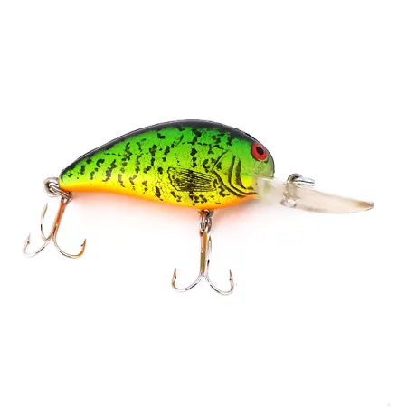 Denna amerikansktillverkade variant av Bomber Model A väger 1/3 oz (9 g) och har en specialiserad ytfinish designad för synlighet i svagt ljus. Kroppen är täckt av ett fluorescerande grön-gult mönster med hög synlighet och mörka, fläckiga fjälliknande prickar, särskilt framtaget för UV-reflektion. Som visas på den andra bilden reagerar den UV-reaktiva färgen under vissa ljusspektrum, en teknisk funktion som Bomber integrerat för att hjälpa sportfiskare som jagar gös eller gädda i djupa eller grumliga miljöer. Detta bete, betecknat som Model 6A, är designat för att nå djup på 1,8–2,4 m (6–8 ft) vid både spinnfiske och trolling. Den kompakta kroppen på 5,5 cm (2 1/4") är utrustad med en lång, klar dyksked av plast och två uppsättningar vassa trekrokar i silverfinish. Med betyget 5/5 är exemplaret i utmärkt skick och behåller sina livfulla färger och originaldelar. Ett klassiskt rött öga ger en tydlig fokuspunkt på huvudet, vilket bevarar det traditionella utseendet hos Bomber-serien samtidigt som modern glow-in-the-dark-teknologi inkorporeras under produktkod 10480.