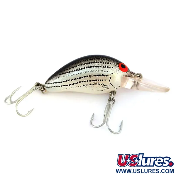Horisontella svarta ränder löper längs den silverfärgade kroppen på denna Bomber Model B 4A, vilket skapar ett mönster med hög kontrast som toppas av en djupsvart rygg. Identifierad med produktkod 10605, är detta 4,5 cm (1 3/4") långa bete i 5/5-skick, vilket bevarar den livfulla röda färgen på dess överdimensionerade ögon. Den genomskinliga skeden är byggd för djup mellan 0,9 m (3 ft) och 2,1 m (7 ft) och är designad för kastfiske eller trolling efter gädda och gös. Detta USA-tillverkade flytande crankbait väger 7 g (1/4 oz) och är utrustat med sina originaltrekronor i silverton och en fjäderring i rostfritt stål.