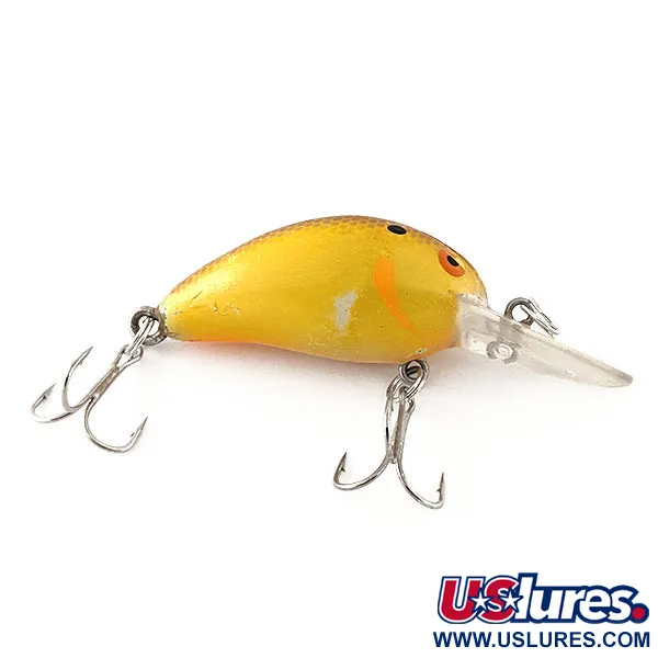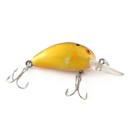 Med en vikt på 7 g är denna kompakta Bomber model B 4A en klassisk amerikansk vobbler som förblir en stapelvara för fiske efter gös och gädda. Med ett djupgående på 0,9–2,1 m är den flytande konstruktionen väl lämpad för både spinnfiske och trolling över strukturer på medeldjup. Finishen är i en slående gul färg, kompletterad med ett orange inslag på flanken och ett mörkt fjällmönster över ovansidan av den 4,5 cm långa kroppen. En klar dyksked i plast bär upp hårdvaran, som inkluderar två original trekrokar. Detta exemplar med produktkod 12074 är i skick 4/5 och uppvisar minimala ytmärken som speglar dess historia samtidigt som den har kvar sin livliga finish. Kontrastrika ögon med orange kant och svarta prickmönster på hjässan ger det distinkta utseende som kännetecknar Bomber-serien.