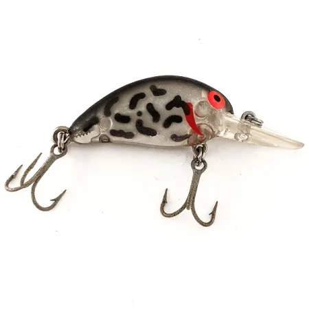 Med en vikt på exakt 1/4 oz (7 g) är denna kompakta crankbait ett utmärkt exempel på det hantverk som gjorde Bomber till ett välkänt namn inom amerikansk betestillverkning. Detta exemplar på 1 3/4" (4,5 cm), med produktkod 12519, har en genomskinlig kropp i rök-silver prydd med tydliga svarta leopardfläckar och subtila röda gälmarkeringar. Den är designad som ett flytande bete och använder en klar, rundad sked för att nå djup mellan 0,9 och 2,1 m (3-7 fot), vilket är ett klassiskt intervall för aktiv gös eller gädda. Den visuella profilen förstärks av karakteristiska röda ögon med svarta pupiller, ett drag som samlare ofta letar efter i tidiga Bomber-modeller av plast. Hårdvaran är i 5/5-skick, med två vassa trekrokar och en robust fjäderring. Model B-serien härstammar ursprungligen från USA och bidrog till att definiera den moderna kategorin av wobblers för grunt till medeldjupt fiske genom sin hållbara gjutna form.