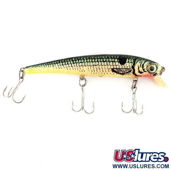 De självlysande egenskaperna på kroppen av denna Bomber Pro Long A Glow gör den till ett unikt fynd för alla sportfiskare som specialiserat sig på nattfiske eller fiske i svagt ljus. Detta exemplar på 15 g (1/2 oz) har produktkod 11213 och har ett detaljerat fjällmönster och en mörk rygg över sin självlysande finish. Kroppen på 12 cm (4 3/4") är utrustad med tre trekrokar och är designad som en suspending (svävande) vobbler, vilket innebär att den stannar på sitt djup vid spinnstopp. Den är ett effektivt val för tekniker som stop-and-go, jerking eller trolling, och når djup på 1,2 - 1,8 m (4-6 ft). Den interna konstruktionen inkluderar en rasselkammare som ger ett rytmiskt ljud under hemfisket. Detta USA-tillverkade bete är i utmärkt 5/5-skick och framstår som anmärkningsvärt välbevarat. Det är specifikt avsett för fiske efter gös, gädda och abborre i varierande vattenförhållanden.