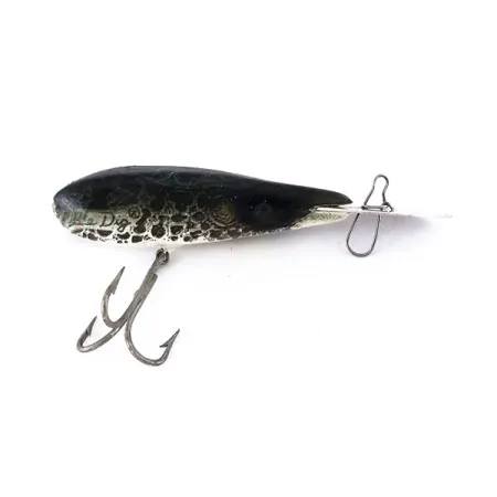 Tyngre än det ser ut med sina 7 g (1/4 oz), är den solida gummikonstruktionen hos detta exemplar ett kännetecken för Burke Flexo-Products Companys arbete från mitten av 1900-talet. Betet har produktkod 10129 och har ett högkontrasterande svartvitt spräckligt mönster designat för att synas i vattnet. En robust dyksked i metall är fäst framtill för att dra ner den flytande gummikroppen vid invevning. Med en längd på 6 cm (2 1/4") har kroppen kvar sina ursprungliga "Big Dig"- och "Burke"-stämplar tydligt på sidorna. Komponenterna visar lätta tecken på användning, vilket ger ett skickbetyg på 3/5. En enkel trekrok är säkert monterad under buken, vilket gör detta till ett komplett stycke fiskehistoria från Michigan.