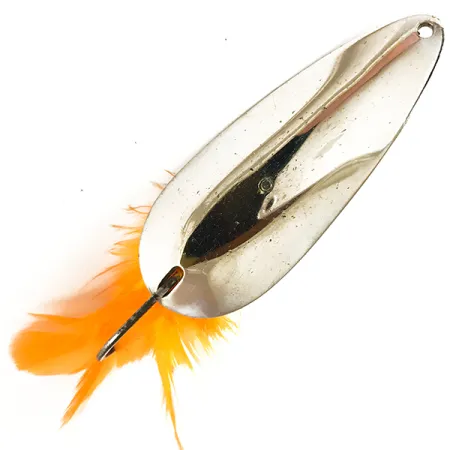 Stämplad med namnen "ACCETTA" och "Weed-Dodger", utmärker sig detta förnicklade skeddrag som ett klassiskt exempel på vasskyddad design från mitten av århundradet. En vikt på 2/3oz (19g) gör det rejält för sin kropp på 2 1/2" (6,5cm). Den polerade nickelytan reflekterar ljuset effektivt, medan en livlig tofs av orangea fjädrar är bunden vid enkelkroken för att ge en visuell fokuspunkt. Weed-Dodger har ett specialiserat trådskydd utformat för att avleda näckrosblad och tät vegetation från krokspetsen, vilket underlättar kast i tät växtlighet. Betygsatt 5/5, visar betet en imponerande ren finish med skarpa bokstäver. Identifierad i databasen under produktkod 3607, representerar det den praktiska uppfinningsrikedom som Tony Accetta förde till sportfiskeindustrin. En robust enkelkrok är integrerad direkt i kroppen, säkrad av en skruvplatta som även förankrar det i metall utförda vasskyddet.