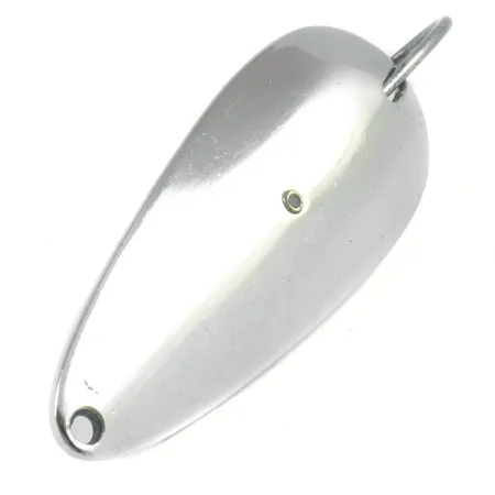 Detta 5,5 cm (2 1/4") skeddrag är polerat till en högblank nickelfinish och representerar en klassiker inom amerikansk design för vasskyddade drag från mitten av seklet. Tony Accetta Weed Doger väger 10 g (1/3 oz) och har produktkod 3211. Den använder en robust enkelkrok som är integrerad direkt i den konkava insidan. Kroken säkras av en karakteristisk skruv som även förankrar ett vasskydd av tråd, en funktion utformad för kast i näckrosor och tät vegetation. På insidan finns präglingarna 'TONY ACCETTA' och 'WEED DOGER' som bekräftar ursprunget från USA. Detta exemplar är i skick 5/5 och har en spegelblank yta på den droppformade kroppen. Den smala framänden har ett precisionsborrat hål för linan, medan den breda bakänden utgör basen för den fasta krokmonteringen.