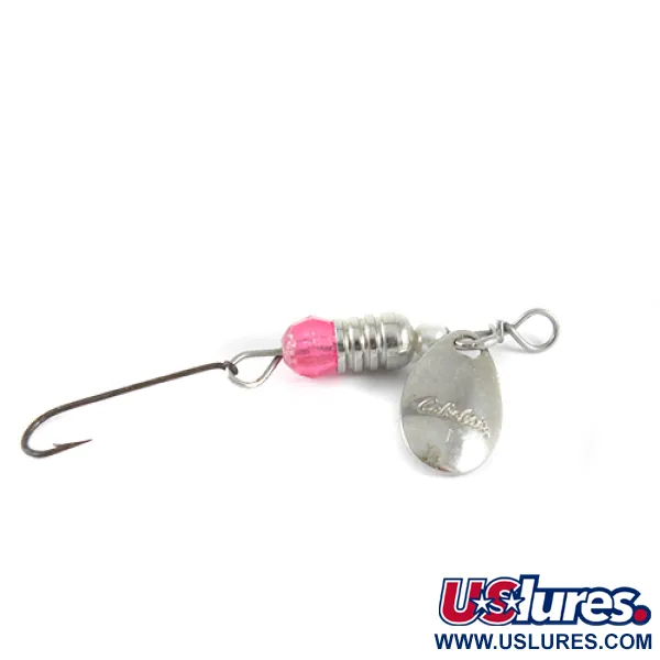 Cabela's varumärke och storleksmarkering "1" är tydligt stämplade i det droppformade nickelskedet, vilket markerar ursprunget från ett ikoniskt namn i amerikansk fiskehistoria. Med en vikt på 2,5 g (3/32 oz) och en längd på 6 cm (2 1/4") har denna spinnare en klassisk uppbyggnad med en klarrosa facetterad pärla följd av en räfflad nickelvikt. En liten vit distanspärla intill bygeln ger en subtil visuell kontrast mot de polerade metallkomponenterna. På trådstommen sitter en enkelkrok med långt skaft, en konfiguration som ofta används för att underlätta avkrokning eller vid fiske i vatten med speciella regler. Detta USA-tillverkade exemplar, identifierat med produktkod 1540, har en mjuk och autentisk karaktär på sina metallytor och håller skicket 4/5.