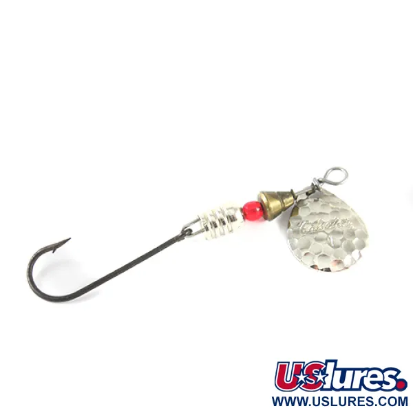 Den hamrade texturen på det droppformade skedbladet fångar ljus från olika vinklar och reflekterar ett ljust nickelsken. Denna klassiska inlinespinnare från Cabela's med produktkod 1542 är 7 cm lång och ett robust exempel på funktionell tackledesign. Med en vikt på 4 g är den ett lämpligt val för lätt fiske efter öring eller abborrfiskar. Konstruktionen inkluderar en livfull röd pärla mellan en mässingsfärgad konisk distans och en silverfärgad räfflad kroppsdel för visuell kontrast. Monterad på en enkelkrok med långt skaft, är denna konfiguration avsedd för sportfiskare som föredrar ett enklare alternativ till trekrokar. Nickelfinishen är mycket välbevarad och visar tydligt den stämplade Cabela's-logotypen på bladets framsida, med ett totalt betyg på 5/5.