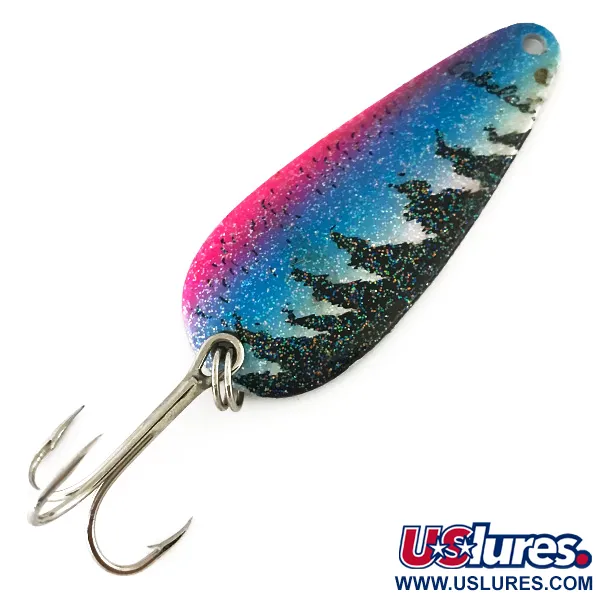 En vikt på 12 g ger detta skeddrag den densitet som krävs för långa kast på djupt vatten eller över strömmande vatten. Öring-färgsättningen är visuellt slående, med en livlig neonrosa och blå gradient kraftigt accentuerad med multifärgat glitter. Längs kanten på den 5,5 cm långa kroppen ger svarta silhuetter av barrträd en högkontrasterande detalj mot den glittrande bakgrunden. På betets huvud är varumärket Cabela's tryckt i en stilren, svart text. Skeddragets baksida är färdigställd i briljant polerat silver, avsett att skapa en kraftig reflex som kontrasterar mot den målade framsidan. Detta USA-tillverkade bete, listat under produktkod 8517, är utrustat med en hållbar fjäderring och en vass trekrok. Betygsatt 5/5, betet är i utmärkt skick med en finish som förblir ljus och intakt.