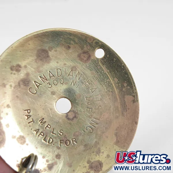 En varm guldfinish täcker den 18 g (2/3 oz) cirkulära kroppen på detta vintageexemplar. Tillverkad av Canadian Bait i USA mellan 1960 och 1970, representerar denna 5 cm (2") disk en minimalistisk era av dragdesign. Den tunga metallplattan är centrumborrad med ett extra monteringshål nära kanten, vilket ger mångsidighet för olika riggningsmetoder. Den har en stor, enkel offset-krok fäst via en standard fjäderring, byggd för hållbarhet vid fiske på djupt vatten. Under produktkod 0797 visar detta drag tecken på sin ålder med ett skickbetyg på 3/5, med viss ytmattering och slitage längs metallens kanter. Den mässingsfärgade ytan behåller en gedigen lyster, vilket gör den till ett distinkt tillskott för alla samlare som fokuserar på amerikanska fiskeredskap från mitten av århundradet.