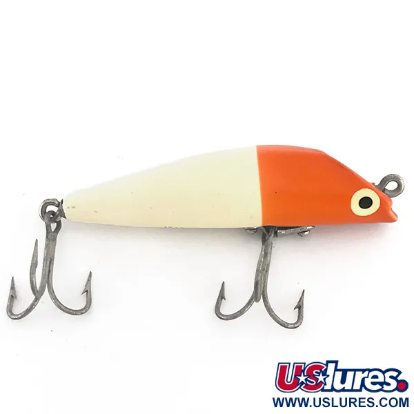En klassisk röd/vit tvåfärgad finish definierar denna 10 g (1/3 oz) ytpopper, med ett ljust huvud och en gräddfärgad kropp. Betet mäter 9 cm (3 1/2") och har stämpeln "BOONE CASTANA" på undersidan, ett tecken på det USA-baserade företagets hantverk. Hårdvaran inkluderar två bukmonterade trekrokar fästa med robusta riggar, konstruerade för hållbarhet vid hugg i ytan. För modell 7643 är den skålade munnen den främsta egenskapen för att skapa vattenrörelse. Med ett skick på 4/5 är färgen fortsatt klar över kroppen, med endast mindre tecken på ålder på metallöglor och krokspetsar. Denna vikt gör den till ett mångsidigt val för sportfiskare som fiskar på grunt vatten eller nära växtlighet.