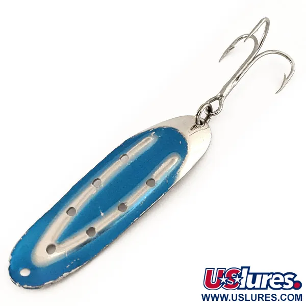Med en längd på 6 cm (2 1/4") är denna Lake Products Charger ett klassiskt exempel på amerikansk trollingutrustning från mitten av seklet. Finishen i Nickel / Blått är anmärkningsvärt välbevarad och har ett distinkt V-format mönster skapat av kontrasten mellan den klara blå färgen och den blanka förnicklingen under. En serie små perforeringar löper längs kroppen, ett funktionellt designelement som ofta användes av Lake Products för att påverka dragets gång i vattenpelaren. Skeddraget väger 6 g (3/16 oz) och är utrustat med en robust trekrok med brett gap, monterad via en kraftig fjäderring, redo för fiske eller samlarhyllan. Detta specifika exemplar, katalogiserat under produktkod 11292, har skicket 5/5 och uppvisar originalglansen på metallytorna. Varumärkets ursprung återspeglas i den solida konstruktionen och de rena linjerna som är typiska för vintageutrustning tillverkad i USA.