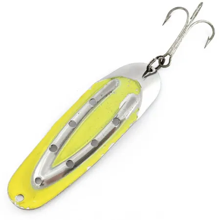 Klar gul färg fyller den V-formade präglade skåran på detta 8 cm (3 1/4 tum) skeddrag, vilket ger en högvisuell kontrast mot den polerade nickelfinishen. Rustowicz tillverkade denna Charger №3-modell, identifierad med produktkod 22103, i USA med en distinkt perforerad design med sex runda hål längs de upphöjda kanterna. Dessa perforeringar konstruerades för att påverka vattenmotståndet och trycket under en jämn invevning. Med en vikt på 12,5 g (2/5 oz) är draget utrustat med en robust trekrok monterad med en enkel fjäderring i aktern. Detta exemplar är i mycket välbevarat skick, graderat till 4/5, där den gula emaljen och nickelpläteringen endast visar obetydliga tecken på sin ålder. En fästpunkt i fören möjliggör direkt knut på linan eller användning av ett beteslås för spinnfiske.