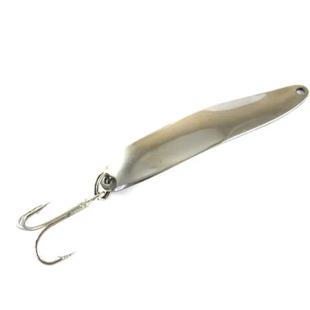 Tydligt präglat i den polerade metallen på baksidan finns märkningen 'CHE'GEGON USA', vilket identifierar detta klassiska skeddrag som en del av amerikansk sportfiskehistoria. Med en vikt på 1/2 oz (15 g) erbjuder detta förnicklade bete den tyngd som krävs för långdistanskast eller för att nå djupare vattenlager. Den 8 cm (3 1/4") långa kroppen har en mjuk, långsträckt kurva utformad för att fånga och reflektera ljus. När det gäller hårdvaran hittar du en robust trekrok säkrad med en kraftig fjäderring i stjärten, medan huvudet har ett rent borrat hål för lininfästning. Detta specifika exemplar, identifierat med produktkod 1031, är i utmärkt skick med betyget 5/5 och uppvisar en blank, spegelliknande nickelyta som har bevarats anmärkningsvärt väl. Dess enkla men effektiva design är typisk för amerikanska metallbeten från mitten av århundradet, där hållbarhet och en profil med hög reflektionsförmåga prioriteras.