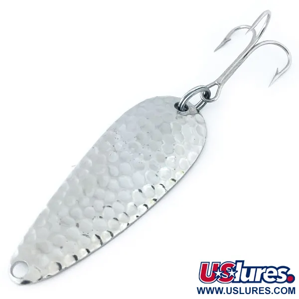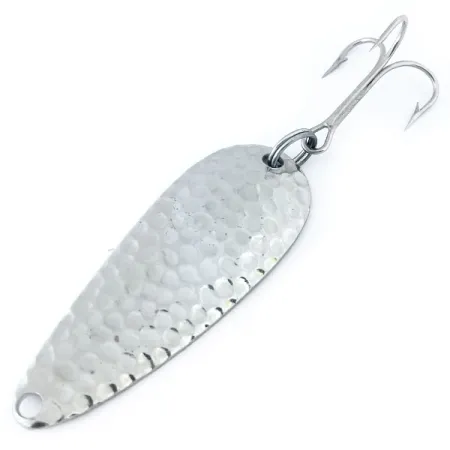 Hamrad förnickling ger en högreflekterande yta på detta 10g (1/3 oz) Chippewa Steel Spoon, en textur speciellt framtagen för att reflektera ljus från flera vinklar. Med en längd på 5,5 cm (2 1/4") är detta Worth-bete ett klassiskt exempel på amerikanskt metallhantverk från mitten av århundradet som dominerade fiskelådorna under senare hälften av 1900-talet. Framsidan kännetecknas av sitt hamrade mönster, medan baksidan har en slät finish stämplad med varumärket och dess ursprung USA. Detta exemplar, med produktkod 10965, har ett ljust och rent utseende som motsvarar dess 5/5-skick. Det levereras riggat med en stor trekrok fäst via en robust fjäderring baktill. Dessa skeddrag användes för kastfiske eller trolling efter gädda, abborre eller större öring i olika typer av vatten.