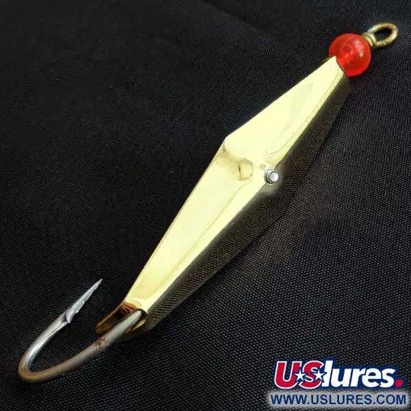 På insidan finns den tydliga stämpeln 'THE GENUINE CLARK SQUID ST. PETE., FLA.', vilket intygar att detta är en äkta James E. Clark-produkt från Floridas kust. Betet väger 8g (1/4oz) och har en skarp rombformad profil med en polerad guldplätering som reflekterar ljus från flera vinklar. En enskild röd pärla är placerad vid huvudet nära linöglan, vilket ger en subtil visuell accent mot den metalliska kroppen. Den vasskyddade designen bygger på en kraftig enkelkrok som är säkrad med en central skruv, ett kännetecken för tillverkarens funktionella inriktning på kustfiske. Detta exemplar, med produktkod 18817, är i nyskick (5/5) och har kvar sin blanka reflekterande yta och rena monteringsdetaljer. Kroken är integrerad i skedens geometri via ett litet fäste på den konkava sidan.