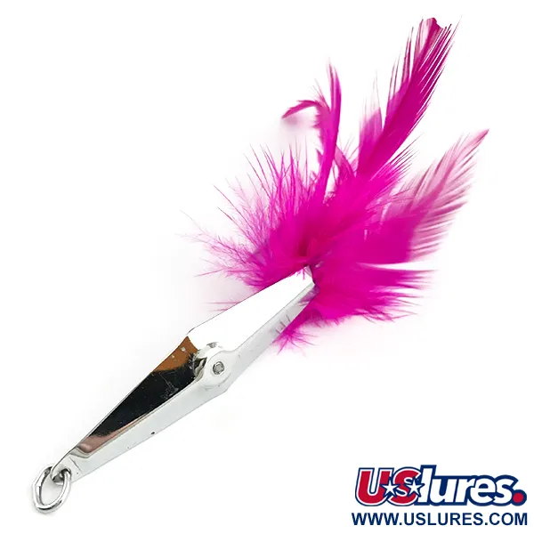 Med en vikt på 5 g (3/16 oz) pryds kroppen på denna James E. Clark-skapelse av ett knippe livfulla chockrosa fjädrar. Detta specifika Clark Spoon-drag, med artikelnummer 5856, mäter 4,5 cm (1 3/4") och har den polerade kromfinish som kännetecknar amerikanska skeddrag av hög kvalitet. Dess vasskyddade utförande bygger på en enkelkrok som döljs i fjäderstjärten, utformad för fiske i tät vegetation utan att fastna. Den reflekterande metallytan och ringarna är välbevarade och visar endast lätta hanteringsspår motsvarande skick 4/5. En fjäderring är fabriksmonterad i den främre öglan för direkt knytning av linan.