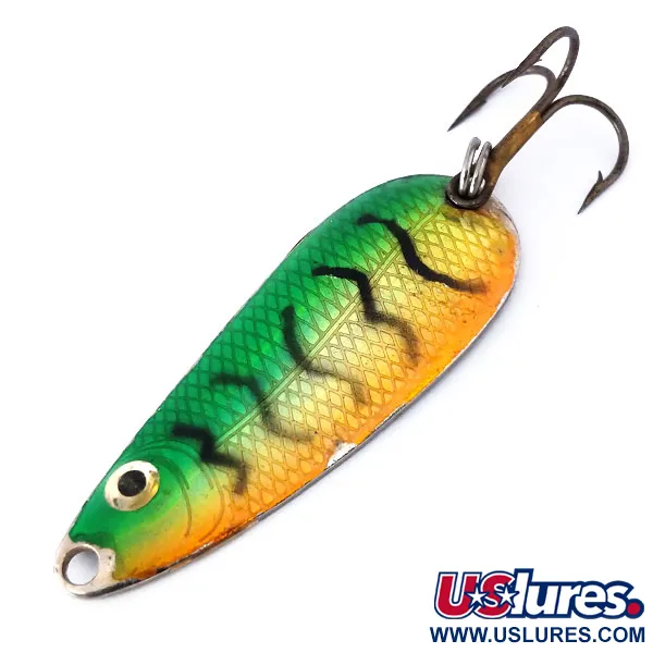 Doppad i en levande Rainbow Perch-finish, speglar detta 9 g (1/3 oz) tunga skeddrag i metall de klassiska designprinciperna från äldre amerikanska fiskeredskap. Profilen på 5,5 cm (2 1/4") uppvisar ett präglat fjällmönster som fångar ljuset under de gröna och orangea nyanserna. Ett målat guld- och svartöga nära nosen ger en naturtrogen målpunkt för rovfiskar. Identifierad som produktkod 10468, har detta Wahoo Class Tackle-drag en baksida i ren metall med mindre åldersrelaterade fläckar, vilket ger ett skickbetyg på 4/5. Kraftig hårdvara, inklusive en stark fjäderring och trekrok, gör detta USA-tillverkade bete redo för spinnfiske mot växtlighet eller trolling vid djupa strukturer.