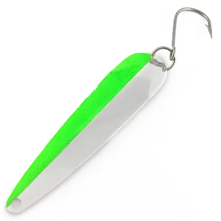 Med en vikt på 4,5 g (3/16 oz) är den smala profilen hos detta amerikansktillverkade skeddrag utformad för presentationer i klart vatten där ett specifikt blänk krävs. En livlig neongrön rand löper längs ytterkanten av den polerade nickelkroppen, vilket ger en tydlig kontrast mot den reflekterande metallytan. Denna Clear Water 101-modell, identifierad med produktkod 23201, mäter 8 cm (3 1/4") och har en klassisk avsmalnande form som är vanlig hos traditionella skeddrag för både spinnfiske och trolling. Bakre delen av betet är utrustad med en robust enkelkrok säkrad med en kraftig fjäderring, en konfiguration som ofta föredras av öring- och laxfiskare för dess solida krokningar och minskade risk för bottennapp. På baksidan är varumärket stämplat direkt i den rena nickelfinishen. Detta exemplar är i ett oklanderligt skick (5/5) och visar inga tecken på användning på vare sig de målade eller pläterade ytorna. Fästhålet för linan i nosen är intakt och redo för riggning.