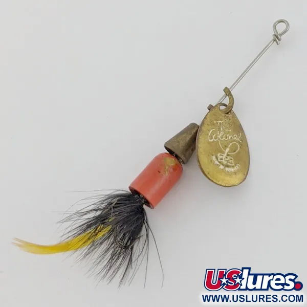 Mässingskomponenter definierar konstruktionen av denna 4 g (1/8 oz) spinnare, med ett stansat skedblad märkt "THE Colonel". En klar röd cylindrisk kropp sitter bakom en konisk mässingsvikt, vilket ger en stabil profil för kastet. Ramen på 5,5 cm (2 1/4") avslutas med en fjäderklädd trekrok, med tjock svart hackel och en enkel gul fjädertrailer. Klassad till skick 5/5, mässingsytorna förblir blanka och den röda färgen på kroppen är välbevarad. Katalogiserad under produktkod 24524, monteringen hålls på en rak trådaxel som slutar i en enkel ögla för linan.