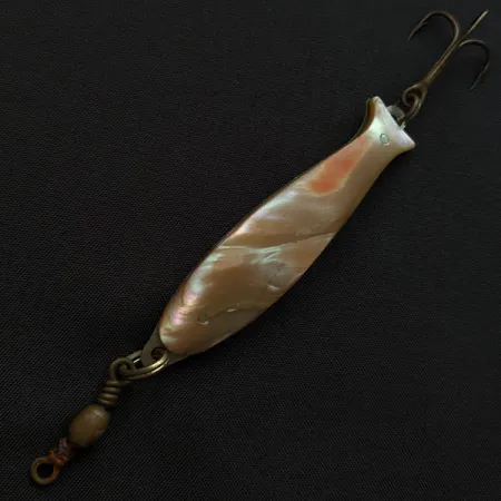 Detta Compac-skeddrag är 7 cm långt och visar upp hantverksskickligheten i japansk redskapstillverkning från mitten av seklet genom användningen av ett gediget stycke iriserande pärlemor. Det naturliga skalet är noggrant format för att passa dragets fiskliknande profil och är fäst vid den silverfärgade metallbasen med två synliga nitar. Med en vikt på 14 g (1/2 oz) ger modell 19657 tillräcklig massa för både kastfiske och djuptrolling. Den metalliska baksidan är polerad och slät, vilket skapar en vacker kontrast till det organiska skimret från abalone-inlägget. Draget är utrustat med ett robust lekare i nosen och en bronserad trekrok i stjärten. Detta specifika exemplar är i ett enastående skick, vilket motiverar betyget 5/5. Det japanska ursprunget speglar en period då Compac var känt för att importera unikt dekorerade skeddrag som kombinerade estetisk dragningskraft med funktionell hållbarhet.
