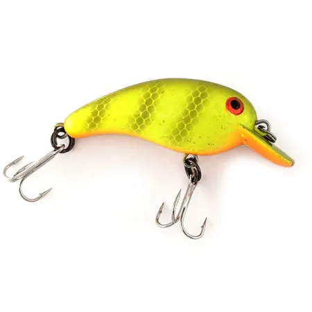 Klargul lackering med ett klassiskt bikakemönster definierar finishen på detta kompakta 4 cm (1 1/2") crankbait. Med en vikt på 4 g (1/8 oz) är denna Cotton Cordell Big O ett utmärkt exempel på produktkod 11219, utrustad med den karaktäristiska fyrkantiga hakskeden (square lip) designad för fiske på djup ner till 0,9 m (3 fot). Den livfulla gula kroppen kompletteras av en subtil orange buk och slående röd-svarta ögon, ett färgschema som ofta föredras för fiske efter abborre, asp och gädda i olika vattenförhållanden. Detta exemplar tillverkat i USA är i enastående skick och har fått betyget 5/5 för sin rena yta och intakta komponenter. Två vassa trekrokar är fästa med robusta fjäderringar, redo att kastas i grunda områden med vegetation. Big O:s korta, knubbiga kroppsprofil hjälpte till att definiera den moderna kategorin för grundgående crankbaits.