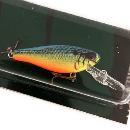 En livlig orangeröd buk ger hög synlighet underifrån på denna 4 g (1/8 oz) Cotton Cordell C.C. Shad. Med en längd på 4,5 cm (1 3/4") identifieras detta bete med produktkod 12920 och är utformat som ett flytande, rasselbete specifikt för fiske efter abborre och gös. Färgsättningen har en djupblå rygg som övergår i gulgröna fjälliga sidor, markerade med en framträdande mörk fläck bakom gällocket. Detta exemplar är oanvänt, med en ren, genomskinlig haksked och originalkrokar med bronsfinish. Beroende på fisketeknik når den djup på 1,8 m (6 ft) vid kast eller upp till 4 m (13 ft) vid trolling. Den tunna konstruktionen med platta sidor är en direkt länk till Cotton Cordells tillverkningsarv i Hot Springs, Arkansas, och denna förpackning speglar företagets produktionsstandard från 2012.