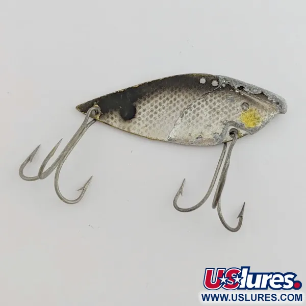 Med en vikt på 3/4 oz (21 g) visar detta silverfärgade vibrationsbete den smarta konstruktion som gjort Cotton Cordell Gay Blade till en klassiker i många fiskelådor. Kroppen på 2 1/2" (6,5 cm) har en karakteristisk plan panna, ett designval som syftar till att skapa ett specifikt motstånd när betet dras genom vattnet. På ryggsidan finns tre separata fästpunkter; genom att använda hålet närmast nosen möjliggörs en snabbare hemtagning med mindre motstånd. Detta exemplar, märkt med produktkod 24446, är i skick 4/5. Det uppvisar visst lätt färgsläpp på den viktade nossektionen där silvret möter de gula ögonaccenterna, men det präglade fjällmönstret på sidorna är fortfarande skarpt och tydligt. Två original-treblekrokar sitter säkert monterade och fullbordar detta klassiska amerikansktillverkade bete. Blyhuvudskonstruktionen ger en låg tyngdpunkt som håller betet upprätt vid presentationer på djupt vatten.