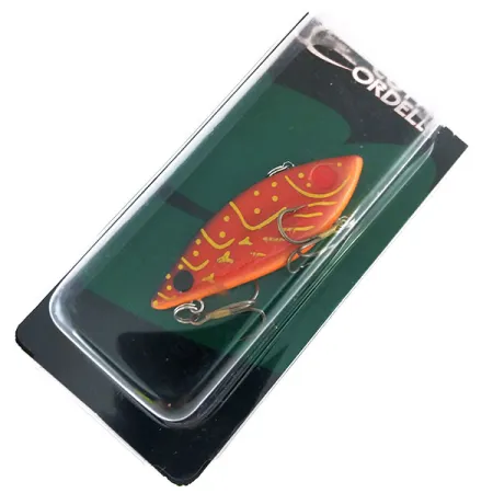 Livliga orangea och röda nyanser definierar kroppen på denna Cotton Cordell Super Spot, som bär produktkod 9744. Med en vikt på 7g (1/4oz) och en längd på 5,5cm (2 1/4") är detta läpplösa sjunkande bete byggt för mångsidighet på olika djup, oavsett om du kastar eller trollar. Det detaljerade gula mönstret med linjer och punkter över den varma basfärgen efterliknar en kräfta eller en liten betesfisk, kompletterat med ett tydligt svart öga som huggpunkt. Detta exemplar levereras i sin originalförpackning och är oanvänt, med ett skickbetyg på 6. Den interna rasselkammaren är utformad för att skapa ljud under invevning, en signaturfunktion för Super Spot-serien sedan starten i USA. Betet är idealiskt för arter som gädda, abborre eller gös, och dess kompakta profil gör det enkelt att fiska genom olika vattenlager.