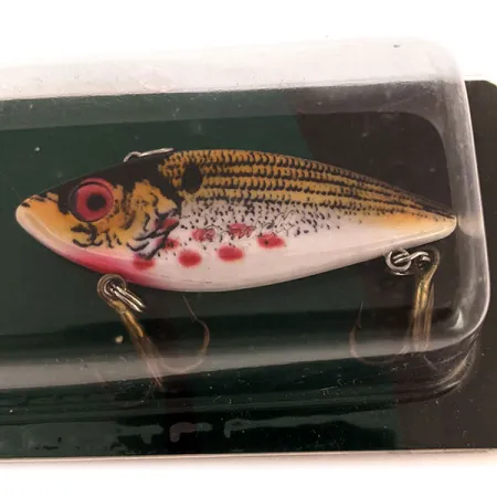 Livliga röda ögon parat med tydliga karmosinröda "blödningsfläckar" längs flanken definierar den visuella karaktären hos detta 7 g (1/4 oz) lipless crankbait. Med ett mått på exakt 5 cm (2") representerar detta exemplar Cotton Cordells arv av ljudliga beten designade för ett variabelt djupområde. Finishen uppvisar ett guldfärgat fjällmönster över den övre halvan, som smidigt övergår i en vit buk. Identifierad med produktkod 12921, är denna sjunkande rattler byggd för både spinnfiske och trolling efter arter som abborre, gädda eller öring. Som en oanvänd vara i sin originalförpackning behåller betet sitt fabriksnya utseende med ett skickbetyg på 6. De guldtonade trekrokarna är blanka och säkrade, medan baksidan av instickskortet beskriver tillverkarens historia med början i Hot Springs, Arkansas.