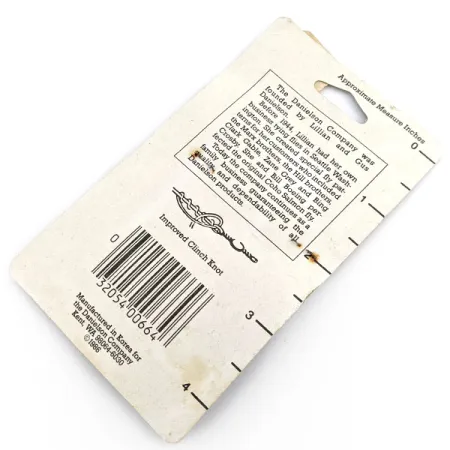 Dessa förnicklade Danielson-kullagerlekanden i storlek #6 säkerställer en jämn rotation för en mängd olika tacklingar. Detta specifika set ur 2300SP-serien med produktkod 19775 är oanvänt och ligger kvar i sin originalförpackning från 1980-talet. Dessa lekanden är tillverkade i Korea och har en robust beteslåsdesign kombinerat med högpresterande kullager för att minimera linvridning. Vintageförpackningen, som fortfarande har en prislapp på $1,27 från Payless, innehåller en kort historik om Danielson Company, grundat av Lillian och Gus Danielson 1944. På baksidan finns ett instruktionsdiagram för en Improved Clinch-knut tillsammans med en praktisk tumstock för snabba mätningar. Dessa lekanden är cirka 1,9 cm (0,75") långa och representerar den klassiska utrustningen som distribuerades från deras huvudkontor i Kent, WA.