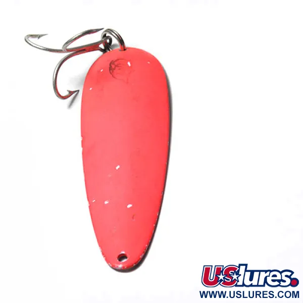 Med en vikt på 28 g (1 oz) har detta bete en rejäl profil för både samlare och aktiva sportfiskare. Skeddraget mäter 9 cm (3 1/2") och den konvexa sidan är utförd i en mörkröd / rosa nyans med karakteristiska vita prickar bredvid den pressade imp-logotypen. På baksidan finns en silverfärgad konkav yta stämplad "DARDEVLE DETROIT USA", en hyllning till Eppingers arv i Michigan. Detta exemplar, med produktkod 0244, är utrustat med en kraftig trekrok och fjäderring. Skicket är bedömt till 4/5 och uppvisar lätta ålderstecken som mindre färgsläpp nära linhålet och längs kanterna. Den inre metallytan är ren och reflekterar ljuset väl.