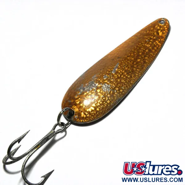 Med en längd på 3 1/2 tum (9 cm) representerar detta skeddrag den robusta sidan av Eppingers sortiment. Denna specifika Dardevle, med produktkod 0306, har den distinkta Crystal (Golden Scale)-ytan – ett texturerat, bärnstensfärgat mönster designat för att reflektera ljus under varierande vattenförhållanden. Med en vikt på 1 oz (28 g) ger den den tyngd som krävs för fiske på djupt vatten eller långdistanskast. På den konkava sidan syns den klassiska DARDEVLE-stämpeln djupt inpräglad i metallen, ett kännetecken för företaget som grundades av Lou Eppinger 1906 i Detroit, Michigan. Den ursprungliga stora trekroken sitter kvar via en kraftig fjäderring, redo för vattnet. Golden Scale-ytan visar visst slitage på den texturerade ytan, vilket gör att den blanka basmetallen syns på vissa ställen, särskilt längs mittpartiet och kanterna. Detta exemplar är rent och har en stark estetisk närvaro, vilket förtjänar ett skickbetyg på 3/5. Det är ett genuint stycke amerikansk fiskehistoria som speglar den hållbara konstruktion som en gång gjorde att dessa drag ingick i överlevnadskit för militärflyget.