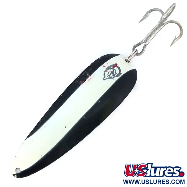 Nickelpläteringen på baksidan ger en hög kontrast mot de svartvita ränderna på framsidan av detta 28 g (1 oz) skeddrag. Eppinger- och Dardevle-märkena är tydligt stämplade i metallbaksidan, vilket speglar den långa tillverkningshistorien som började i Lou Eppingers verkstad i Detroit 1906. Med en längd på 9 cm (3 1/2") har detta exemplar den klassiska djävulshuvud-logotypen med sin karakteristiska röda detalj på den konkava sidan. Just detta drag, produktkod 11016, är i 4/5 skick med välbevarad färg och rena komponenter. Den kraftiga trekroken är säkrad med en robust fjäderring, konstruerad för påfrestningarna vid fiske efter större sötvattensrovfiskar. En fästögla i den avsmalnande änden säkerställer rätt anslutning för traditionellt spinnfiske eller trolling. Det kontrastrika färgschemat är ett mångsidigt val för sportfiskare som möter varierande vattenklarhet.