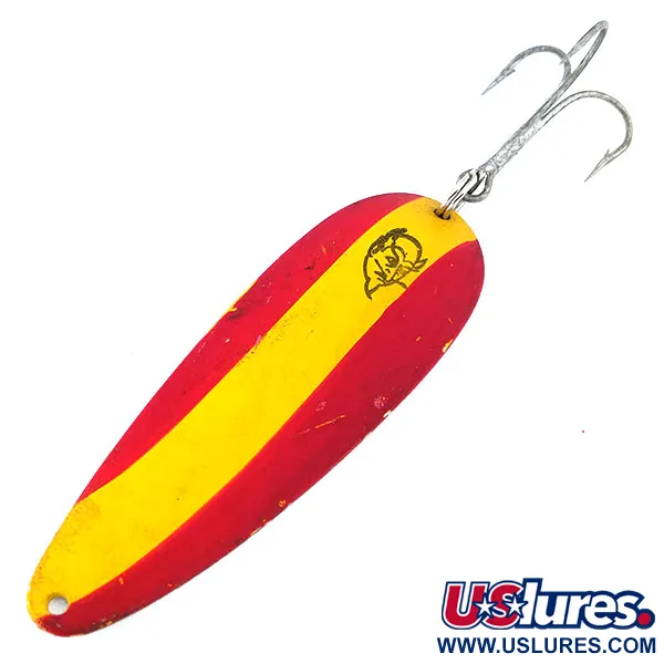 Ett livfullt mönster av röda och gula ränder definierar ovansidan av detta klassiska skeddrag, ett kännetecken för märket Eppinger. Med en vikt på 28 g (1 oz) och ett mått på 9 cm (3 1/2") bär detta exemplar det ikoniska djävulshuvudet tydligt tryckt på det mellersta gula bandet. Om man vänder på draget avslöjas en ren nickelfinish stämplad med "DARDEVLE" och "DETROIT", vilket hänvisar till företagets historiska tillverkningsbas i Michigan. Lou Eppinger började tillverka dessa drag 1906, och denna modell, med produktkod 11017, är fortfarande en stapelvara för spinnfiske och trolling. Hårdvaran består av en robust trekrok säkrad med en fjäderring i bakänden. Med ett skick på 5/5 är de målade ytorna välbevarade och visar endast minimala tecken på ålder. Metallens konkava form är speciellt konstruerad för att interagera med vattnets motstånd under en jämn hemtagning. Detta USA-tillverkade drag är försett med ett fästhål i den smala änden, redo för en tafs eller ett beteslås.