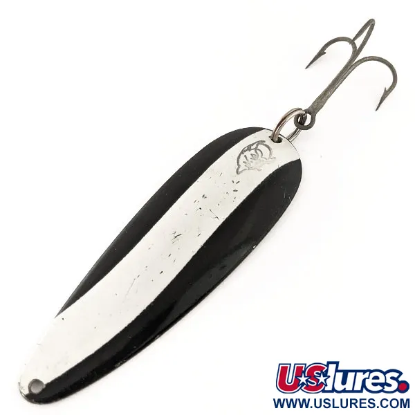 En tydlig svart och vit diagonal rand definierar framsidan på denna 28 g (1 oz) Eppinger-klassiker, ett färgschema som många erfarna sportfiskare föredrar för dess höga kontrast under varierande ljusförhållanden. Detta Dardevle-drag (produktkod 11461) mäter 9 cm (3 1/2") och har den ikoniska djävulshuvudlogotypen stämplad i metallen på framsidan, ett märke för det hantverk från Detroit som Lou Eppinger startade i sin källare för över ett sekel sedan. Baksidan har en ren nickelfinish, tydligt stämplad med namnet 'DARDEVLE' och 'MADE IN USA', vilket speglar varumärkets långa tillverkningshistoria i Michigan. Detta exemplar är i 5/5 skick och behåller sina skarpa färglinjer och polerade metall. Den kraftiga konstruktionen är parad med en trekrok i vintagestil och en robust fjäderring, designad för långdistanskast eller trolling i måttliga hastigheter.
