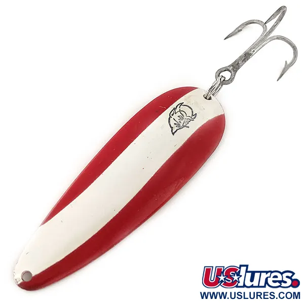 Stämplad med det klassiska "DARDEVLE DETROIT U.S.A."-märket på sin baksida i nickel, representerar detta exemplar en central del av Michigans sportfiskehistoria. Detta 28 g (1 oz) tunga Eppinger-skeddrag, katalogiserat under produktkod 11582, har det ikoniska röd- och vitrandiga mönstret som har varit en stapelvara i fiskelådor i årtionden. Metallkroppen mäter 9 cm (3 1/2 tum) och kännetecknas av sin distinkta avlånga form och djupa konkava buk. Framsidan är detaljerad med den igenkännbara svarta djävulshuvud-grafiken, ett adelsmärke för märket Eppinger sedan dess tidiga dagar i Lou Eppingers butik i Detroit. Finishen är i 5/5-skick och visar en ren kontrast mellan de målade ränderna och den polerade nickel-färgade basen. En kraftig trekrok är fäst via en förstärkt fjäderring vid stjärten, medan nosen är förborrad för ett beteslås eller knut. Dess betydande vikt gör det till ett pålitligt val för långdistanskast eller trolling på djupt vatten efter gädda och muskellunge.