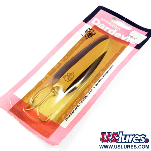 Med en vikt på 28 g (1 oz) är denna Eppinger Dardevle byggd för långa kast och för att nå djupare vattenlager. Just denna modell med produktkod 1404 mäter 9 cm (3 1/2") och har det svart-vitrandiga mönstret med hög kontrast som varit en klassiker för gädd- och muskyfiskare i decennier. Draget är oanvänt och ligger kvar i sin vintageförpackning med rosa kant från produktionstiden i Dearborn, Michigan. En utmärkande detalj är den stämplade djävulshuvudlogotypen på metallkroppen, som är skarp och tydlig mot finishen. Utrustningen inkluderar en kraftig trekrok fäst med en robust fjäderring, typiskt för den hållbara konstruktion som Eppinger är kända för. Med sin profil på 9 cm utgör skeddraget en stor visuell måltavla vid jämn hemvevning. Förpackningen är välbevarad och identifierar draget som en äkta produkt från Eppinger Mfg. Company, Dept. B.