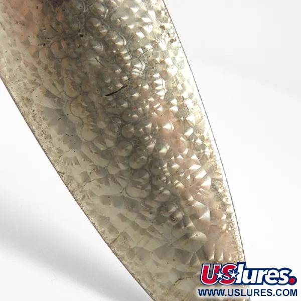 En skimrande hamrad silverfinish definierar detta exemplar på 1 oz (28 g), som visar upp den klassiska "Crystal" silverfjällstexturen. Med en längd på 3 1/2" (9 cm) bär detta Eppinger Dardevle (produktkod 1605) det djupt stämplade arvet på sin konkava undersida, tydligt märkt med ursprunget Detroit, U.S.A. Metallytan förblir ljus och reflekterar ljuset över sina strukturerade fasetter avsedda för en distinkt vaggande gång under en jämn invevning. När det gäller hårdvaran håller fjäderringen en robust trekrok på plats. Skicket är klassat till 4/5, med endast mindre ytliga märken som inte förtar den högblanka finishen. Detta exemplar har den karakteristiska avlånga droppformade profilen som har gjort märket till en klassiker sedan Lou Eppingers tidiga dagar. Baksidan av draget har en polerad nickelton, vilket framhäver de läsbara tillverkarmärkena och den ikoniska logotypen som är stämplad i metallen.
