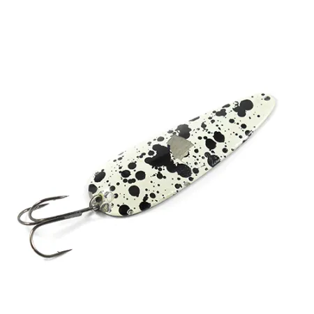 Detta skeddrag på 28 g (1 oz) har en kontrastrik 'Dalmatian'-finish och utgör ett unikt estetiskt val i Eppingers legendariska sortiment. Draget mäter 9 cm (3 1/2") och har den karakteristiska konkava profilen som ger en signifikativ vickande gång vid jämn hemtagning. På baksidan är den nickelpläterade ytan stämplad med 'DARDEVLET' och 'DETROIT U.S.A.', vilket intygar det tillverkningsarv som inleddes av Lou Eppinger 1906. Detta specifika exemplar, med produktkod 2370, har ett skickbetyg på 4/5, med välbevarad färg på den konvexa sidan och en klar metallisk lyster på baksidan. Den kraftiga metallen och den vassa trekroken reflekterar den funktionalitet som en gång gjorde dessa drag till standardutrustning i flygvapnets överlevnadskit. Att använda ett skeddrag med nickelbaksida är en beprövad taktik för fiske i klart vatten där maximalt blänk krävs för att locka till sig uppmärksamhet. Fjäderringarna är fortfarande strama och säkrar kroken för både tungt kastfiske och trolling.