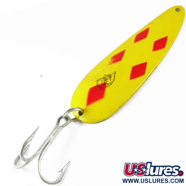 Gul lackering prydd med fem karakteristiska röda ruter identifierar detta mönster, en klassiker för gädd- och muskiefiskare. Med måtten 9 cm (3 1/2") och vikten 28 g (1 oz) bär detta Eppinger Dardevle skeddrag, med produktkod 3497, själen av innovation från Detroit. På baksidan finns stämpeln som visar dess ursprung i Detroit, USA, en detalj som daterar designen till företagets tidiga tillverkningsperiod. Den konkava metallkroppen är konstruerad för att skapa en vaggande gång vid jämn hemtagning. Finishen är välbevarad med en ren yta som endast visar minimala tecken på användning, vilket motsvarar ett skick på 4/5. Draget är utrustat med en kraftig silverfärgad trekrok fäst med en fjäderring, och den klassiska djävulshuvudlogotypen syns på framsidan nära buken. Detta exemplar framhäver de unika gjutformar som Eppinger har använt i över ett sekel för att bibehålla betets specifika geometri och viktfördelning.