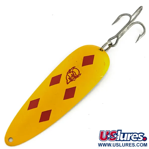 Fem tydliga röda diamanter sticker ut mot den klassiska gula finishen på detta vintage skeddrag, vilket omedelbart identifierar det som det ikoniska "Five of Diamonds"-mönstret. Med en vikt på 28 g (1 oz) och en längd på 9 cm (3 1/2") bär detta exemplar det karakteristiska djävulshuvudet stämplat direkt på den målade ytan. Eppinger har tillverkat dessa i Michigan ända sedan Lou Eppingers tidiga dagar i Detroit, och detta specifika drag, listat under produktkod 9103, har kvar den höga byggkvalitet som gjort märket till en klassiker i nordamerikanska fiskelådor. Baksidan har de autentiska "Dardevle"- och viktstämplarna direkt i metallen, som uppvisar en exceptionellt ren yta. Utrustat med en robust trekrok och en kraftig fjäderring är det redo för spinnfiske eller trolling efter större rovfiskar som gädda eller muskellunge. Skicket på just detta drag är utmärkt och får betyget 5/5. Den avlånga formen och den konkava profilen är kännetecken för de egenutvecklade formar som Eppinger använder för att säkerställa att varje drag håller deras historiska standard för amerikansktillverkad fiskeutrustning.