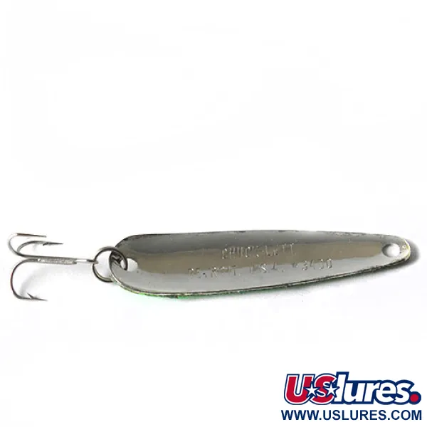 En hamrad metallstruktur täcker den nedre halvan av detta 5g skeddrag, vilket ger en mångfacetterad reflekterande yta som kontrasterar mot den övre delens livfulla gröna glitterfinish. Denna specifika Dardevle Chuck-lett, katalogiserad under produktkod 0167, representerar en klassisk storlek i Eppingers sortiment med sina 6,5 cm. Färgkombinationen Nickel/Grön är ett taktiskt val för klart vatten där den ljusa blänken efterliknar fjällen hos små bytesfiskar. En liten, stämplad djävulshuvudlogotyp – ett kännetecken för Eppinger-företaget sedan dess tidiga dagar i Detroit – är synlig nära fjäderringen. Detta skeddrag är utformat för trolling och har en avlång kropp som interagerar med vattentrycket för att skapa en tydlig rörelse. Skicket är bedömt till 4/5, med lätta spår av hantering men med en vass original-trekrok och livfulla färger.