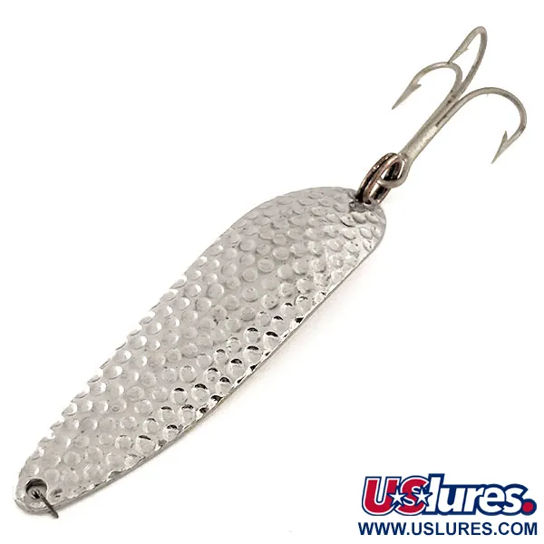 Hamrad nickelplätering definierar den slående texturerade ytan på detta Eppinger-skeddrag, som reflekterar ljus effektivt från alla håll. Med en längd på 8,5 cm (3 1/4 tum) och en vikt på 21 g (3/4 oz) representerar detta exemplar den klassiska Dardevle Cop-E-Cat-modellen. Skicket är anmärkningsvärt rent, vilket ger betyget 5/5 för dess blanka finish och vassa krok. Katalogiserad under produktkod 11638, är baksidan stämplad med Cop-E-Cat-varumärket och namnet Eppinger, ett arv från produktionsanläggningen i Dearborn, Michigan. Det är utrustat med en kraftig trekrok fäst via en robust fjäderring i stjärten. Den konkava metallkroppen är tillverkad med egna USA-tillverkade verktyg, framtagna specifikt för kastfiske och långsam hemtagning. Ett litet linhål i den avsmalnande fronten ger en säker anslutning för fiskarens tackel.