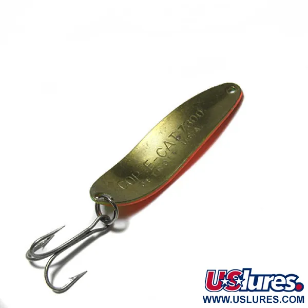 Med en vikt på 10 g (1/3 oz) ger denna Eppinger-skapelse den nödvändiga massan för långa kast även i lätt motvind. Denna Dardevle Cop-E-Cat 7300, med produktkod 0415, har ett Fire Tiger-mönster med hög synlighet över en kropp i massiv mässing. Skeddraget mäter 5,5 cm (2 1/4") och uppvisar den klassiska avlånga formen som har gjort Lou Eppingers design till en stapelvara i fiskelådor sedan början av 1900-talet i Detroit. Finishen är i 4/5-skick, med välbevarade färger och tydliga svarta vertikala ränder som kontrasterar skarpt mot den orange, gula och gröna gradienten. På den nedre delen av den konvexa sidan syns den karakteristiska varumärkesstämplingen nära fjäderringen. Utrustningen inkluderar en kraftig trekrok fäst via en robust fjäderring. Eftersom draget är byggt på en mässingsbas erbjuder det en annan ljusreflektion jämfört med förnicklade versioner, vilket ofta föredras i klart vatten där en subtil blixt önskas. Tillverkningsarvet för dessa beten är fortfarande centrerat i Michigan, där traditionen att använda egna formar för att bibehålla metallens specifika krökning fortsätter.