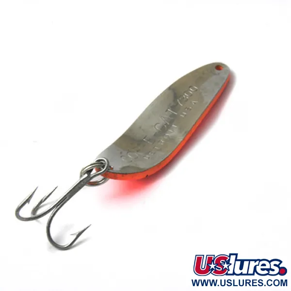 Sex tydliga svarta prickar är stämplade på den livfulla orangea finishen på detta klassiska amerikanska skeddrag. Med en vikt på 14 g (1/2 oz) och ett mått på 5,5 cm (2 1/4") bär denna Eppinger Dardevle Cop-E-Cat 7300 den ikoniska Devil Head-logotypen som har identifierat dessa Michigan-födda drag i över ett sekel. Den röd-orangea färgen ger en profil med hög kontrast, medan den stansade metallkroppen är designad för mångsidigt kast- och trollingfiske. Identifierad med produktkod 0449, består hårdvaran av en robust trekrok och en pålitlig fjäderring. Just detta exemplar är i skick 4/5, vilket visar hållbarheten i Lou Eppingers ursprungliga tillverkningsstandarder. Den konkava insidan ger den nödvändiga vattenförflyttningen för dess karaktäristiska rörelse genom vattenpelaren.