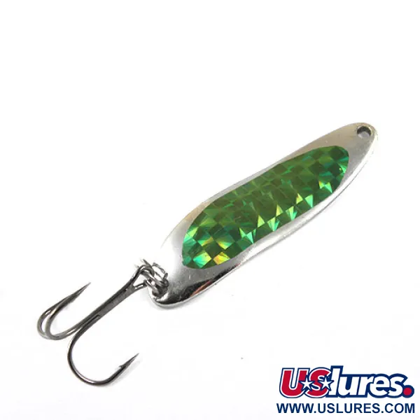 Detta skeddrag mäter exakt 5,5 cm (2 1/4") och har den ikoniska stämplade märkningen från en legendarisk tillverkare i Michigan. Baksidan av draget är tydligt präglad med namnet Eppinger, modellbeteckningen "COP-E-CAT 7300" och ursprunget "USA". På framsidan ger en livlig grön holografisk bikaketejp en skimrande kontrast mot den polerade nickelbasen och reflekterar ljus i flera riktningar. Med en vikt på 10 g (1/3 oz) är skeddraget i en mångsidig storlek för både spinnfiske och lätt trolling. Detta exemplar är i skick 5/5 och framstår som oanvänt med en blank, ren finish på både den pläterade ytan och originalkrokarna. Eppingers produktion i Dearborn, Michigan, fortsätter att använda egna gjutformar som ger dessa skedar deras specifika konkava profil, ett designelement som förblivit oförändrat sedan Lou Eppingers tidiga dagar. Hårdvaran fullbordas av en vass trekrok fäst via en robust fjäderring i stjärten.