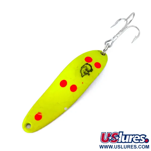Fluorescerande gul färg täcker den konvexa sidan av detta skeddrag, designat för att synas på olika vattendjup. Med en längd på 5,5 cm (2 1/4") och en vikt på 10 g (1/3 oz) har detta Eppinger Dardevle Cop-E-Cat 7300 produktkod 10359. Finishen har tydliga röda prickar över en gul bas som är både fluorescerande och UV-reaktiv, vilket skapar ett starkt grönt sken under ultraviolett ljus i mörker. En förnicklad baksida ger den nödvändiga blixteffekten för att komplettera färgen. Denna specifika form, framtagen genom Eppingers egna tillverkningsverktyg i Michigan, ger en distinkt vaggande gång vid invevning. Draget är i skick 4/5, där färgen och den stämplade djävulshuvud-logotypen förblir skarpa och tydliga. Det har kvar sin originalutrustning, inklusive en silverfärgad trekrok och fjäderring.
